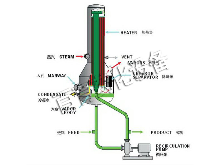 需濃縮的料液由泵送入加熱管頂部,沿著加熱管內(nèi)壁形成液膜向下流動(dòng)。在這個(gè)過程中,由于管外的加熱,管內(nèi)液膜開始沸騰并部分蒸發(fā)。在列管下部分及其下游的分離器中,剩余的液體和蒸汽得以分離。