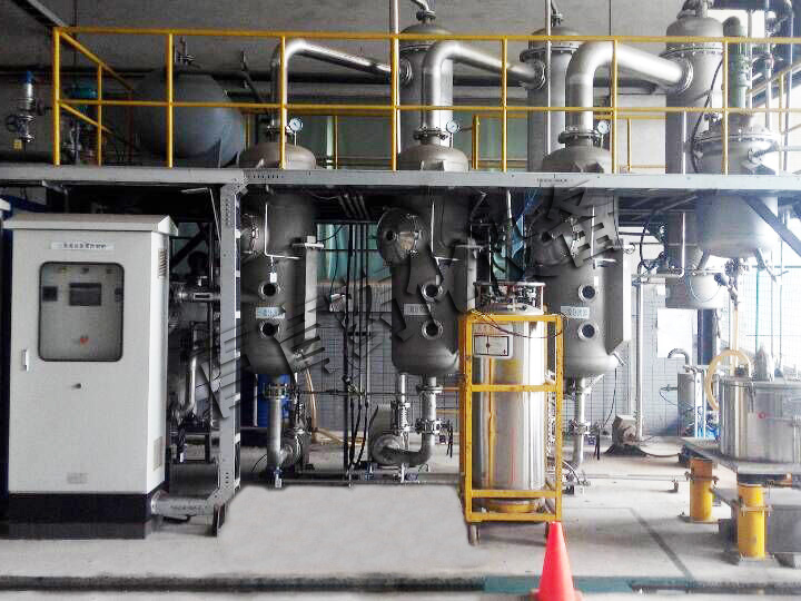 三效蒸發(fā)器是將一個(gè)蒸發(fā)器產(chǎn)生的二次蒸汽再次當(dāng)作加熱源,引入另一個(gè)蒸發(fā)器,只要控制蒸發(fā)器內(nèi)的壓力和溶液沸點(diǎn),使其適當(dāng)減少,則可利用蒸發(fā)器產(chǎn)生的二次蒸汽進(jìn)行加熱。結(jié)晶機(jī)此時(shí),蒸發(fā)器的冷凝處就是蒸發(fā)器的加熱處。